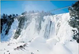 Montmorency falls frozen. Montmorency Falls outside Quebec City is perhaps most stunning in the winter months when the cliffs surrounding the falls freeze and mist from the waterfall accumulates in a small hill at its foot. The Frozen Beauty of Montmorency Falls. Parc de la Chute-Montmorency.
